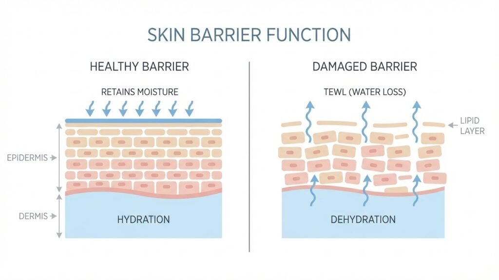 Your skin barrier acts like a shield, locking in moisture and keeping irritants out. When harsh cleansers disrupt it, transepidermal water loss (TEWL) increases, meaning moisture escapes faster than your skin can hold onto it.