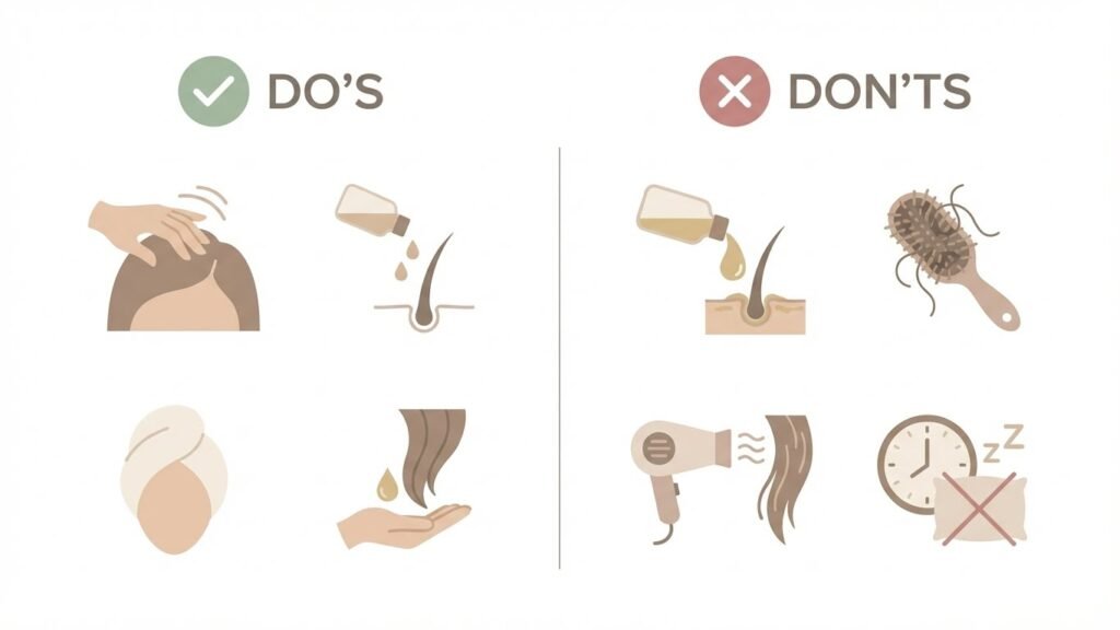 If you oil hair overnight, protect your pillowcase, avoid heavy oils, and shampoo thoroughly in the morning.