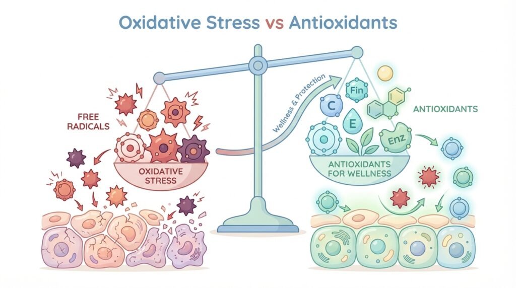 • Oxidative stress happens when free radicals outnumber antioxidants in your body.
